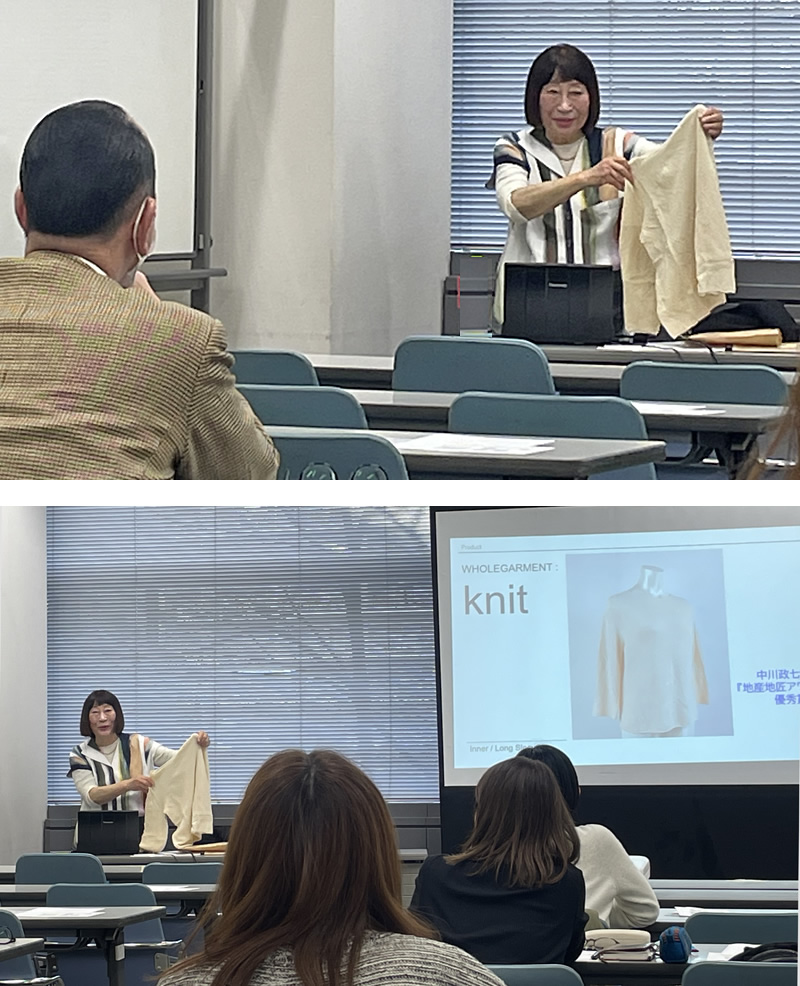 最後に、商品化まで10年を要した無縫製ニット「スパイラルミグ」もご紹介いただきました。肩が上げづらい方でも襟から履くように着用でき、体格の良い方でも伸縮性があるため無理なく着ることができます。